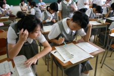 中学の全クラスには電波時計が設置されているうえ、テスト問題の配布は裏返しに行うなど、時間管理と厳正な実施を行っています。「始め」の合図と共に一斉に教室に響くペンの音。「終わり」の声と共に発せられる溜息。安堵の溜息になるか、絶望の溜息になるかは中学生たちの努力次第です。