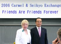 カーメル市の姉妹都市、河内長野市の橋上義孝市長のご出席をいただいて、サイエンス棟レクチャールームで、サヨナラセレモニーが行われました。安達校長から、カーメル生へ修了証書が、ホストファミリーへ感謝状が手渡され、平和と友好を祈る「Love in Any Language」の大合唱がわき上がりました。