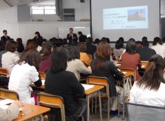 センターは、40年以上前から症状の重い心身障害がある子どもを療育して来ました。今回はHPS(ホスピタル・プレイ・スペシャリスト)の歴史、活動内容を紹介。参加者の中には話をうかがいつつ涙ぐむ生徒もありました。その後は「子どもの権利(国際)条約」を基にした「子どもの遊び」を実習。子どもたちに楽しんでもらえるように、美術選択者たちが作品制作を準備し、贈る予定です。