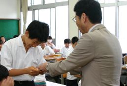 朝のHRに突然校長先生が来られました。S君は校長先生からバースデーカードをもらい、少し照れた様子です。カードには、聖句「光の子として歩みなさい」に続き「日々の学園生活が豊かになりますように」とお祝いのメッセージが書かれていました。優しい笑顔の校長先生からは「一人でも多くの生徒に、直接プレゼントしたい」との想いが伝わってきました。