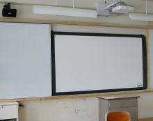 中学のHRには電子黒板、ホワイトボードの取り付け工事が進んでいます。ホワイトボードは左右にスライドし、開けると80インチのワイド型電子黒板が現れます。授業の他、特活教育や行事など多目的に使用されることでしょう。