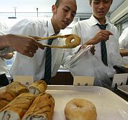3時間目が終わった休み時間から、焼きたてパンの販売が始まります。パンはピザパン(写真右120円)やドーナツ(60円)など、常時20種類以上。チャイムと共に生徒が殺到し、人気のパンはあっという間に売り切れます。質問にT君は「美味しいです!」と即答。