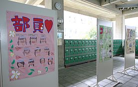 中学ロッカーゾーンでは、部活動壁新聞が展示されています。これは文化祭で展示したものですが、出演を控えゆっくり見て回る時間が無かった生徒の為に、また、来校者に本校の様子を知ってもらうために、展示しています。スペースの関係で、全体を三期に分割しての展示になります。