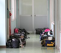 試験中机上には筆記用具しか出すことはできません。机の中は聖書・讃美歌を含め空っぽに、鞄は閉じて、教室前後のスペースに並べます。廊下突き当たりのクラスは特権を活かして、鞄は廊下へ片付けています。