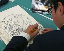 中高の美術部員は、「大阪発達総合療育センターの子供達に送る絵」を制作しています。(2010/06/21記事)高校生が取り組んでいるのは、巾5メートル近い世界のお伽噺の絵。中学生は巾2メートルほどの花が咲き誇った風景画を描いています。