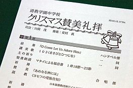 学園の「クリスマス礼拝のご案内」が配布されました。中学は18日にチャペルで中2生による英語降誕劇を、高校は22日旧体育館で、上野芝キリスト教会の三好明久牧師を招いて、クリスマス礼拝を行います。詳しくは本日配布のご案内をご覧下さい。