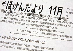 ほけんだより11月号が発行されました。内容は11月の保健行事、中1・高3対象のはしか・風しんの予防接種アンケート、身体測定など。特集として「かかる前のインフルエンザ予防」は紙面の半分を割いて、11項目のポイントを挙げています。このうちあなたは何項目クリアしていますか?