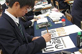 高三連携クラスの書道では、刻字作品が最終段階の着色を迎えています。自分で選んだ文字を何度も書き込み、中でも一番整った姿の字を、木目の綺麗な桂の板に転写し、ノミや彫刻刀で彫りました。文字を掘り込んだ作品や、文字を残して周りを彫った作品など、彫り方にも工夫が見られます。
