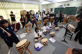 高三連携クラスの音楽では、卒業生でもあり、プロの太鼓の奏者を指導員に迎え、和太鼓を練習しています。息の揃った演奏、体に響く音に、暫しシャッターを切るのもためらうほどの迫力でした。何度もマメをつぶして、本当に血のにじむ努力だったことでしょう。