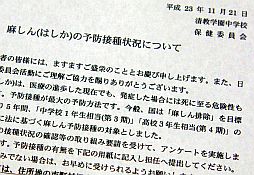 中学1年生と、高校3年生に「麻しん(はしか)の予防接種状況について」アンケートが配布されました。本日配布のプリントをご参照のうえ、24日(木)までに担任にご提出ください。保護者の署名捺印も必要ですので、お忘れの無いようにお願いします。