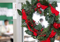 教室の出入り口には、PTAが特大のリースを用意してくれました。クリスマスリースは永遠を意味する「環」です。これを、ドアに飾り、厄除けにします。また、教室には担任や生徒が用意した、アドベントカレンダーやツリーが飾られ、クリスマスが近いことを日々お祝いしています。