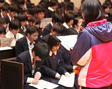 1年生はクラスでハンセン病についてのビデオを鑑賞し、事前に配られた資料やリーフレットも活用しながら、ワークシートに考えをまとめて記しました。本校では春休みに、岡山県瀬戸内市の国立ハンセン病療養所で、フィールドワークを行っています。