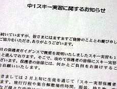 中学1年生に「中1スキー実習に関するお知らせ」などが配布されました。詳細を記した保護者向けの案内は生徒を通じ、二月上旬に配布予定です。本日配布のプリントを熟読の上、ご協力よろしくお願いします。