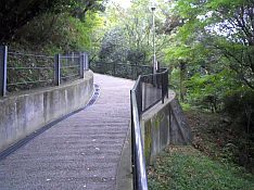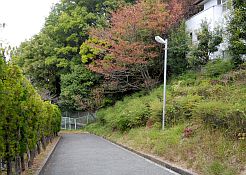 昔のラドン温泉は、今では老人ホームになっています。この建物脇をかすめて、長野公園の方へ登っていきます。駅からの道路、石川に掛かる橋、老人ホーム前の小道、長野公園への入り口、狭い道路が続き地域の人や車も通行します。邪魔にならないように、端に寄って登校することが大切です。坂を少し登ると右側にしらかしの径の入り口が見えてきます。