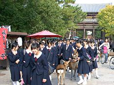 班の行動ルートは事前に班で決めています。一の鳥居から春日大社の長ーい参道を歩いていく班もいました。班のみんなとはぐれないよう、班がばらばらにならないよう、班長さんが主体となってみんなをまとめ、班別自主研修は進みます。