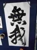 私たち書道部は、女子9人男子4人で、書道室にて活動しています。部員が書いている作品は、主に中国古典や和歌を題材とし、文字の種類は楷書や行書、隷書や仮名などさまざまです。男子も女子もそれぞれ仲良くアットホームな部活ですが、とくに芸文祭直前はビシッと集中します。今年も一夏かけていい作品を書き上げたいです。