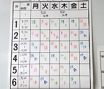 教室を巡るとクラスのカラーが出て、少しずつ雰囲気が違うことに気付かされます。時間割はそんなカラーが最も表れやすいものの一つで、どれも生徒がクラスの一年間を想いながら書いたものばかりです。描画材はクラスに備え付けのマーカーですが、POPな作品や端正な作品など、見ていて楽しいものばかりです。