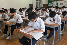 中学一年生は一時間の自習の後、国語と英語の試験を、二年生は英語、理科Ⅰの試験の後、磯観察ガイダンスを、三年生は社会、英語演習、図形の試験を受けました。英語演習の試験ではリスニングテストも行われ、ネイティブの先生が携帯音楽プレイヤーを手に教室を巡りました。
