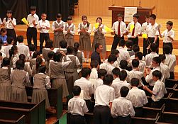 中学の前期生徒会役員立会い演説会がチャペルで行われたました。生徒達は冊子「立候補者からの返答集」を手に、どの立候補者がふさわしいか、熱心に演説に聞き入っていました。その後HRで選挙が行われ、明朝当選者が発表されます。