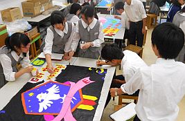中学3年生が美術の時間に制作している体育大会の軍団旗が完成しました。完成までには、意見がまとまらなかったり、スペルを間違えたり、絵の具の入ったカップを倒してしまったり、制服に絵の具がついたりと“数々のアクシデント”もありましたが、メンバーが力を合わせて完成にこぎつけました。カラフルな旗に彩られた体育大会は、とても賑やかなこと間違い無しです。保護者の皆様、是非お越しください。