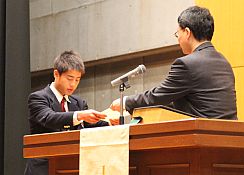 終業式に続いて、表彰が行われました。大阪府内女子中学生英語暗誦大会で入賞した生徒、大会で優秀な成績をあげた中学男子硬式テニス部、中学バレーボール部、中学なぎなた部、中学男子ソフトテニス部、中学剣道部、中学演劇部、中学理科部が表彰されました。