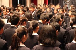 司会が生徒会役員の手に渡り、対面式が行われました。在校生代表として生徒会会長のT君が「わからないことがあれば何でも尋ねてください。私達は新入生の学園生活が輝かしいものになるように、お手伝いします。」と、新入生代表のAさんが「この学園で一生懸命頑張りたいので、よろしくお願いします」と挨拶しました。