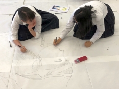 私達ダイアナは、「力強く、迫力のある作品」を目標にデコリーダーを中心にして一生懸命取り組んでいます。皆、部活やデモの練習の合間を縫って協力し、毎日順調に進めています。写真はまだ下書きや端の色塗りをしたものですが、本番はカラフルな、印象に残るパネルになる予定です。優勝目指して頑張ります!!